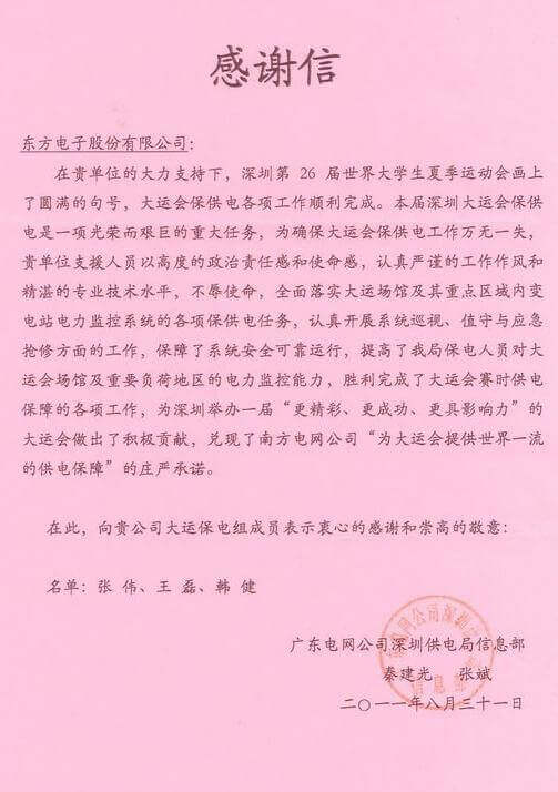 8月23日,世界大学生运动会在深圳圆满落幕,上海拓鹏实业有限公司作为大运会唯一保电企业见证了世界大学生体育运动的蓬勃发展。上海拓鹏实业有限公司技术中心系统部与工程部坚守“忠于职守,全力以赴,誓保大运电网安全”的信念,联手实现了大运保供电期间系统零故障、零缺陷的目标。